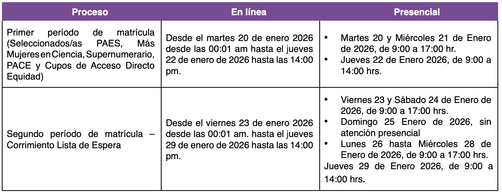 *Para el segundo periodo de matrícula, que corresponde a corrimientos de lista de espera, la Universidad de Santiago de Chile informará, a través de su sitio web, los corrimientos de lista que se puedan generar.