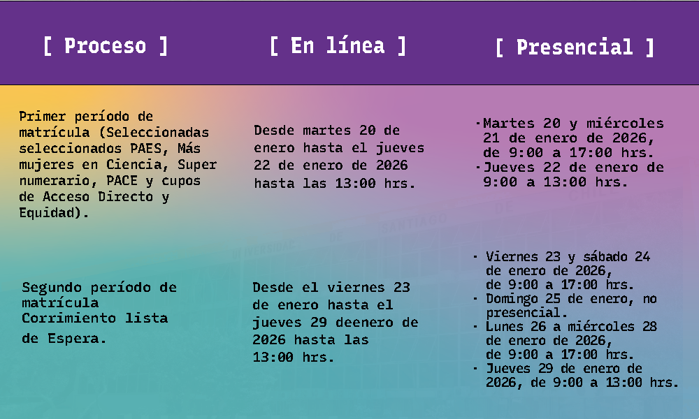 *Para el segundo periodo de matrícula, que corresponde a corrimientos de lista de espera, la Universidad de Santiago de Chile informará, a través de su sitio web, los corrimientos de lista que se puedan generar.
